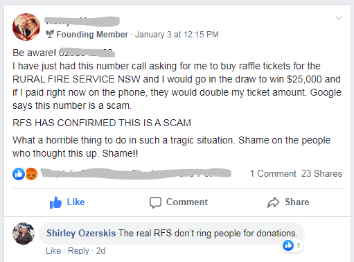 I received news about this scam within just hours of a different type of fake fundraiser that had already appeared in Facebook posts. This other one involved phone callers seeking donations to support the volunteer activities of the New South Wales Rural Fire Service.