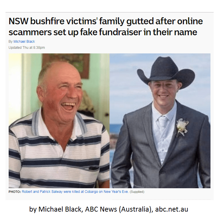 You can read the full story by Michael Black (ABC News, Australia) at https://www.abc.net.au/news/2020-01-02/fire-victims-family-outraged-at-fake-online-fundraiser/11837920